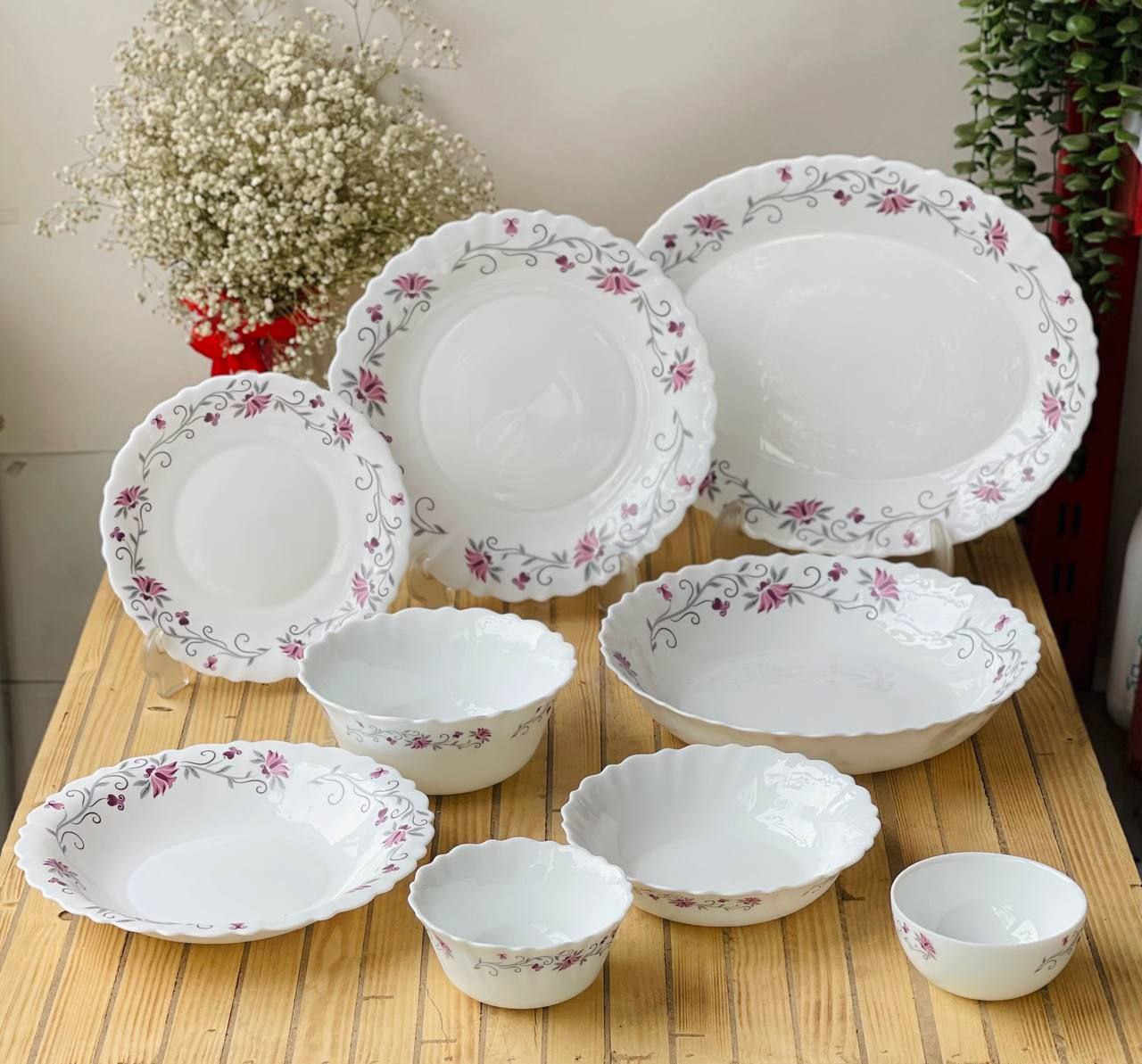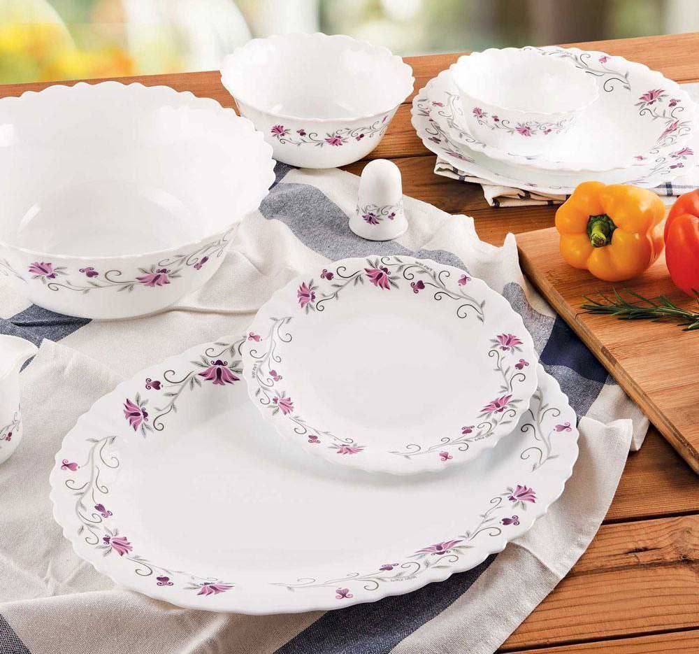 بشقاب تخت ۲۵۰ (پلوخوری)، بشقاب گود ۲۲۵( خورش خوری)، پیشدستی ۱۹۵، کاسه آبگوشت ۷۷۰، کاسه ماست ۷۲۰، کاسه ترشی ۷۱۰، کاسه سالاد ۲۴۰، کاسه سوپ ۷۸۰، قندان ۸۱۰، سس خوری ۸۲۰، دیس بیضی ۱۰۱۰، دیس تخت گرد ۱۰۲۰، دیس گود ۱۰۳۰، دیس بیضی ۱۰۵۰ کباب، فنجان ۲۷۰، لیوان